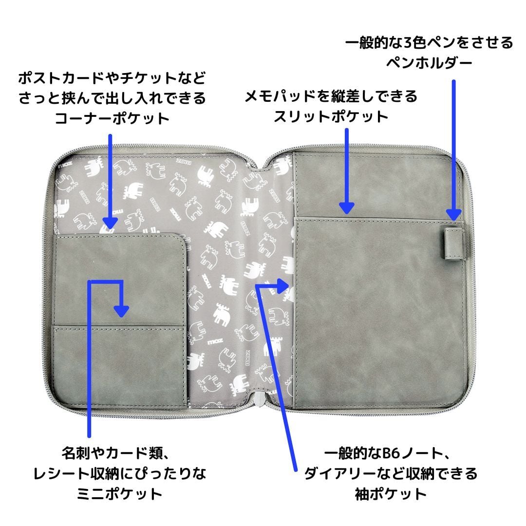 一般的なB6ノート、ダイアリーをセットできる袖ポケットに加えメモパッドを縦差しできるスリットポケット付きダブル収納仕様。